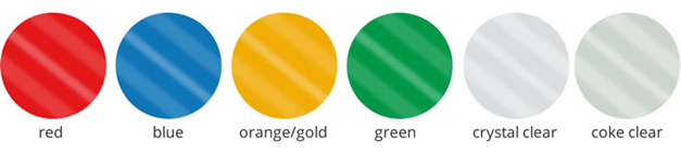Vinilo transparente: rojo, azul, naranja/dorado, verde, transparente como el cristal y transparente como el coque.